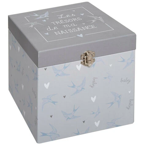 Atmosphera – Coffret de naissance TrĂ©sors Gris 7 pièces (-) Coffret de naissance composĂ© d’une boĂ®te, d’un album photo, de deux petites boĂ®tes souvenir ainsi que des petits sacs en tissu –