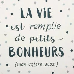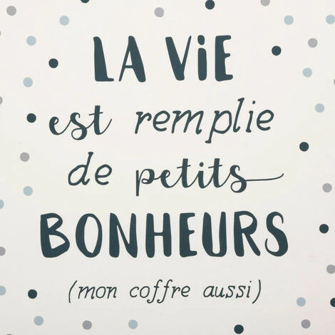 Élément de décoration à part entière, ce coffre séduit avec sa forme évasée, ses motifs pétillants et ses inscriptions.