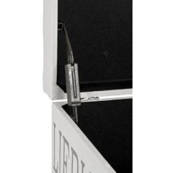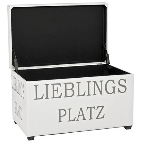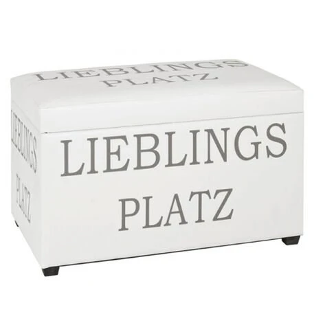 Coffre de rangement coloris blanc en MDF et tissu synthétique aspect cuir motif « Lieblingsplatz », siège rembourré, Revêtement en 80% PVC-20% PU, pieds en caoutchouc dur, mousse 100% PU, intérieur 100% polyester. Dimensions : L65 x P40 x H42 cm. Matière : MDF, tissu. Couleur : blanc, noir. Poids : 9.7 kg.