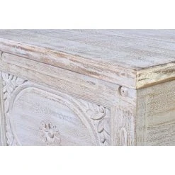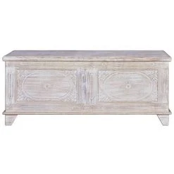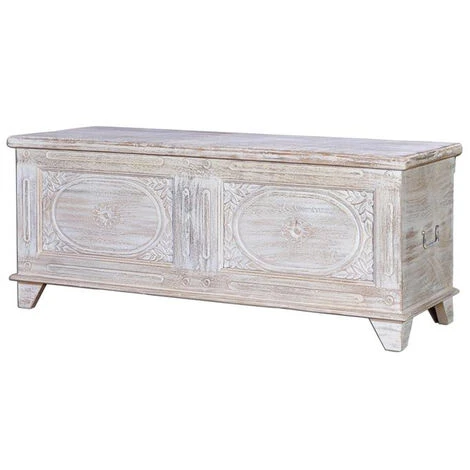 Coffre de rangement en bois de manguier coloris blanc vieilli. Facile à nettoyer. Livré monté. Dimensions : longueur 120 x profondeur 45 x hauteur 50 cmMatière : bois de manguier Coloris : blanc vieilliVolume : 0,27 m³ Poids : 30 KG