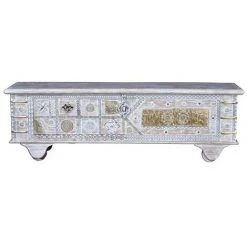 Coffre de rangement en bois de manguier coloris blanc vieilli avec des détails en bronze. Livré monté. Dimensions : longueur 145 x profondeur 40 x hauteur 45 cmMatière : bois de manguier Coloris : blanc vieilliVolume : 0,26 m³ Poids : 20 KG