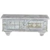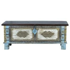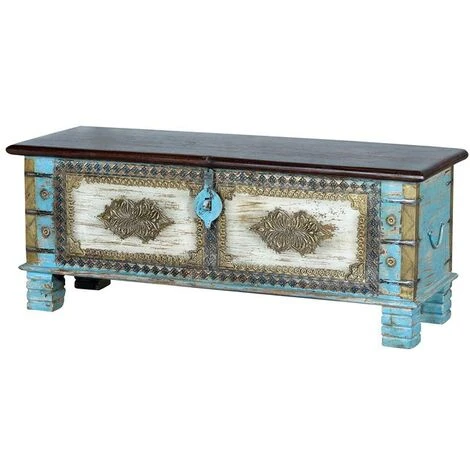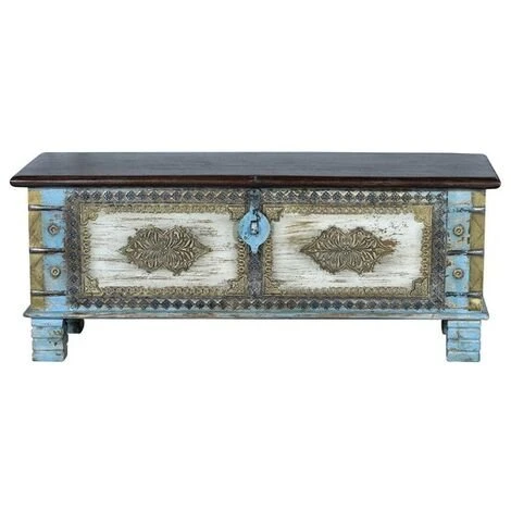 Coffre de rangement en bois de manguier coloris bleu vieilli avec des détails en bronze. Livré monté. Dimensions : longueur 116 x profondeur 40 x hauteur 45 cmMatière : bois de manguier Coloris : Bleu vieilliVolume : 0,21 m³ Poids : 18 KG