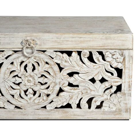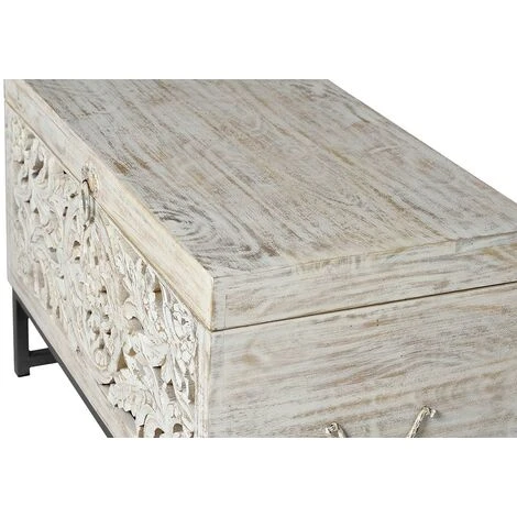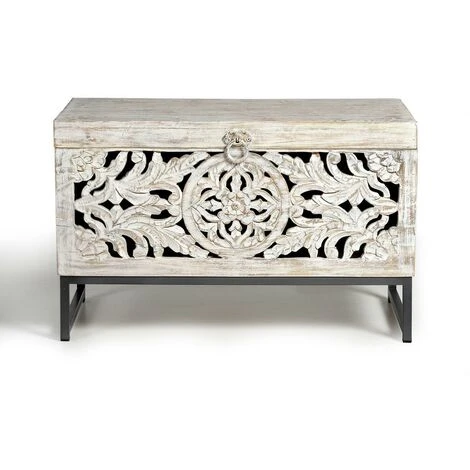 Coffre en bois manguier avec grande capacité de rangement. Facile à nettoyer. Livré monté. Elégant et moderne. Dimensions : longueur 80 x profondeur 40 x hauteur 50 cm Hauteur des pieds : 16 cmMatière : bois de manguier / ferColoris : blanc vieilliVolume : 0,16 m³Poids : 13 KG
