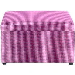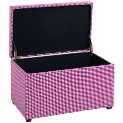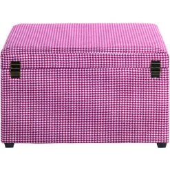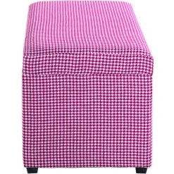 Coffre de rangement en MDF et tissu textile coloris rouge et blanc (pied-de-poule)Assise rembourré et rabattable.Dimensions : Longueur 65 x Hauteur 42 x Profondeur 40 cmMatière : MDF, tissu synthétique aspect cuirCouleur : rouge-blancPoids : 8 kg