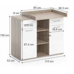 - La commode à langer mesure au total 113 x 100 x 53 cm (l x h x p) et le plan à langer mesure 85 x 9 x 68,3 cm (l x h x p).