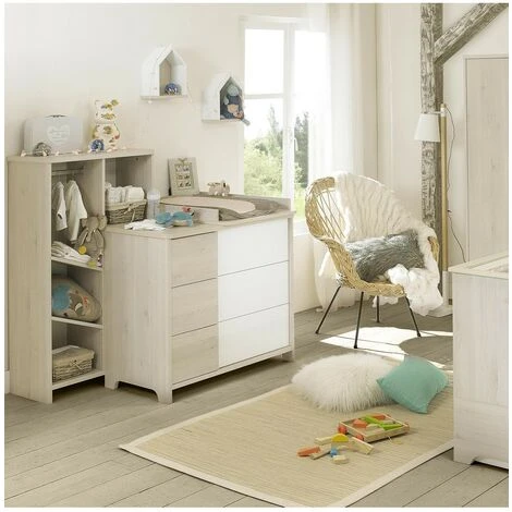 - Le plan Ă langer se positionne sur le dessus Ă la droite de la commode quand la grande bibliothèque se glisse Ă gauche Ă l’arrière de la commode pour y stocker les petits vĂŞtements du quotidien de façon Ă ce qu’ils soient aisĂ©ment accessibles.
