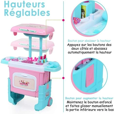 ăLevier multifonction:ăDotĂ©e de fonctions d’Ă©clairage et de rĂ©glage de la hauteur, la table de maquillage offre une expĂ©rience de jeu plus originale Ă votre enfant! La lumiĂšre du miroir et le son du levier peuvent ĂȘtre facilement gĂ©rĂ©s. En outre, des boutons permettent aux enfants de rĂ©gler le levier et le plan de travail Ă diffĂ©rentes hauteurs.