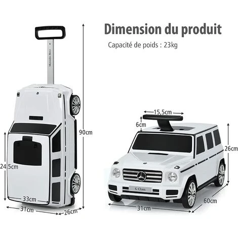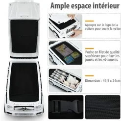 - ăAspect du vĂ©hicule tout-terrain :ăpar rapport aux autres valises, notre valise pour enfants a une apparence de voiture unique, qui est officiellement autorisĂ©e et sous licence par Mercedes Benz. Votre enfant attirera certainement l’attention et s’amusera beaucoup lorsqu’il utilisera cette valise Ă l’extĂ©rieur. Une valise Ă porter aussi cool est idĂ©ale pour les enfants de 2 Ă 6 ans.