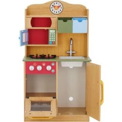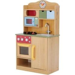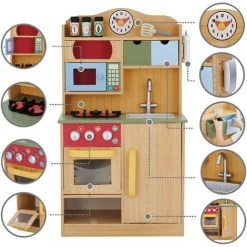 – La cuisinière est munie d’1 four, 1 micro-ondes, 2 plaques de cuisson, 1 horloge, 1 Ă©vier amovible et 3 boutons qui tournent et cliquent pour imiter de vrais sons.