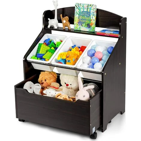 - Détail convivial — Sous trois palettes, un grand tiroir peut être utilisé pour stocker des jouets ou des objets plus grands. En outre, les tiroirs ont des roues à la base, ce qui permet aux enfants de les ouvrir ou de les fermer facilement.