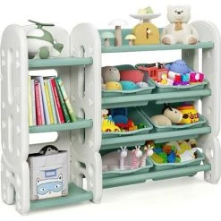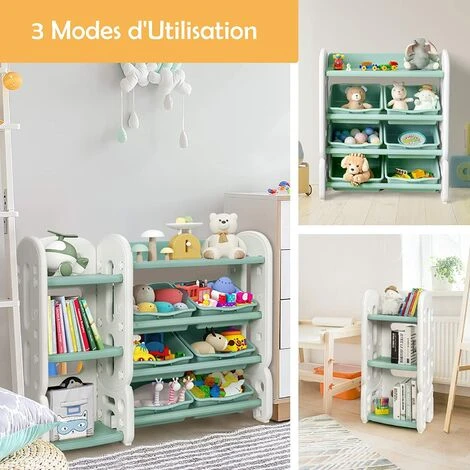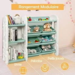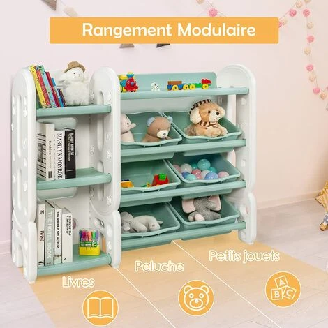 Notre meuble de rangement de jouets fournit un grand espace de stockage pour garder la chambre des enfants ou salle de jeu ordonnĂ©es. Il possède 1 planche de rangement, 6 bacs amovibles et 3 Ă©tagères Ă livre pour trier et ranger les jouets et livres. Il est fabriquĂ© en matĂ©riaux de qualitĂ© qui est durable, non toxique et inodore. Les boĂ®tes de rangement ouvertes et inclinĂ©es facilitent la recherche et l’accès aux jouets. La structure stable, la surface lisse et les coins arrondis assurent une parfaite sĂ©curitĂ©. Aucun outil n’est nĂ©cessaire pour le montage. Ce meuble de rangement aide les enfants Ă dĂ©velopper une bonne habitude de rangement. N’hĂ©sitez pas Ă l’acheter dès maintenant !