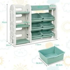 - Comprend 1 plateau, 6 bacs amovibles et 3 étagères pour ranger divers jouets