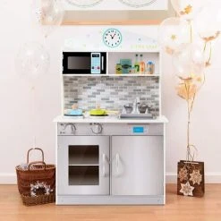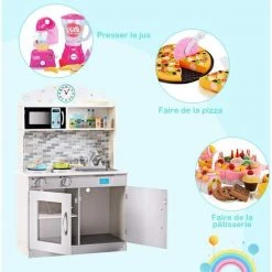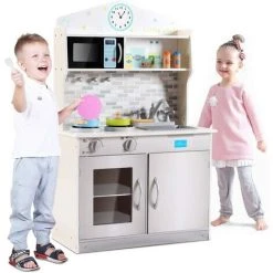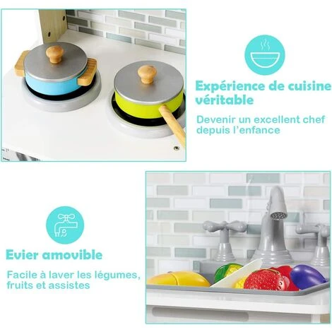 - Notre cuisine pour enfants dans le style rétro, faite à partir de matériaux de la plus grande qualité. Offrez à vos enfants l’opportunité d’exprimer leur imagination ! Cette cuisine de jeu est équipée une porte double, une cuisinière à gaz, une étagère de rangement, un robinet, un évier, en outre, il y a également 2 pots, 2 bouteilles d’assaisonnement, etc.