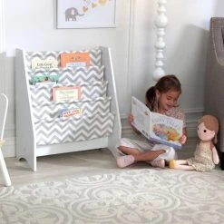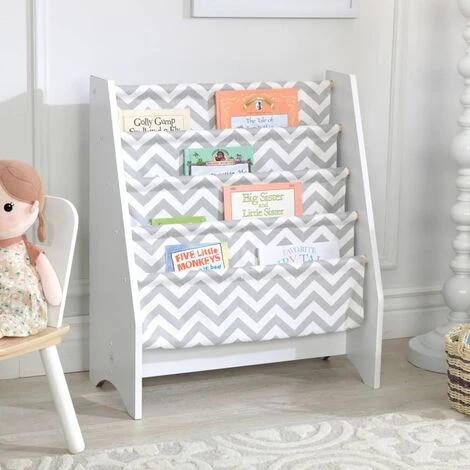 Les quatre étagères en toile de coton douce et profonde en blanc avec chevron gris peuvent protéger les livres à couverture rigide, les livres en carton, les livres à colorier, ainsi que tout autre type de livre ou de magazine que vos enfants aiment. De plus, le cadre robuste en MDF avec cinq attaches garantit que cette bibliothèque à élingues pour enfants gardera les lecteurs enthousiastes heureux pour les années à venir.