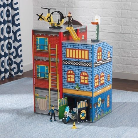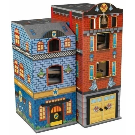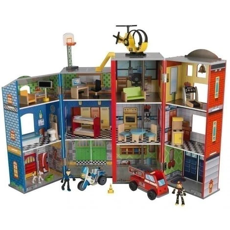 | Composition | 3 Ă©tages + 12 pièces d’espace ouvert + 3 vĂ©hicules de secours (moto de police, hĂ©licoptère et camion de pompier) + chiens et personnages + mât de pompier |