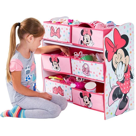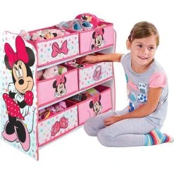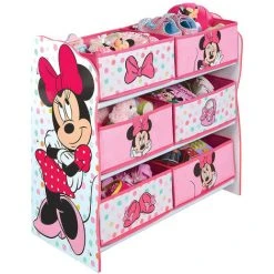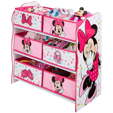 Meuble de rangement rose au joli motif de Minnie Mouse sur un fond blanc avec des pois colorés.