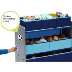 Une Ă©tagère de rangement adaptĂ©e aux enfants, tant au niveau de la taille que du style !Avec ses six bacs textiles dans un très beau camaĂŻeu de bleu dans trois tailles diffĂ©rentes et ses dimensions adaptĂ©es aux enfants (hauteur 67,5cm x largeur 62,5 cm x profondeur 30cm), il nÂ’y a plus dÂ’excuse pour ne pas ranger sa chambre !Les enfants vont adorer customiser les cĂ´tĂ©s de leur Ă©tagère avec les stickers repositionnables offerts avec lÂ’Ă©tagère. Organizer gris 6 bacs souples bleus- Avantage produit : rangement pratique, 6 bacs souples, deux tons de couleurs pour faciliter l’organisation du rangement, montage facile stickers dĂ©coratifs rĂ©utilisables inclus- Dimensions : hauteur 67,5cm x largeur 62,5 cm x profondeur 30cm- Design : bords gris, bacs textiles bleus (clair et navy)- Composition : MDF et tissus- A monter : oui- Age conseillĂ© : 3 ans +
