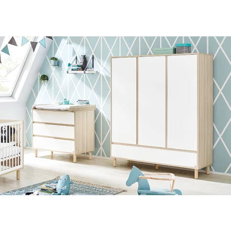 Grande armoire « Flow », avec 2 portes, 5 Ă©tagères rĂ©glables en hauteur, une tringle Ă vĂŞtements, fermeture automatique, fermeture en douceur. DĂ©cor : FrĂŞne avec structure en bois vĂ©ritable et uni, blanc. Dimensions L 155 x P 55 x H 185 cm. Grâce aux 5 Ă©tagères rĂ©glables en hauteur et Ă la tringle Ă vĂŞtements, l’armoire offre de nombreux espaces de rangement pour les vĂŞtements, le linge de lit, les jouets et tout ce qui doit ĂŞtre rangĂ© dans la chambre des enfants. Notre armoire est Ă©quipĂ©e de Self-Soft-Close et Soft-Close, ce qui permet de fermer les portes en toute sĂ©curitĂ© et en silence. En outre, cela permet d’Ă©viter que les petits doigts dĂ©licats des enfants ne soient attrapĂ©s. Le mĂ©lange de couleurs et de matĂ©riaux lĂ©gers fait en sorte que la garde-robe Ă©voque une atmosphère lumineuse et accueillante dans la chambre des enfants. Les pieds de meubles de haute qualitĂ© en pin massif et laquĂ© couleur cendre complètent le design.