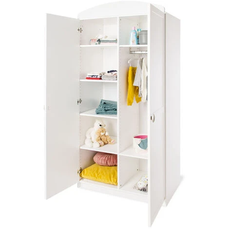 Armoire pratique Ă 2 portes, en dĂ©cor blanc. L’armoire « Laura » sĂ©duit par son design arrondi et convivial. Avec ses deux portes, elle offre beaucoup de place pour tout ce qui doit ĂŞtre rangĂ©. A l’intĂ©rieur, « Laura » est Ă©quipĂ©e de 6 Ă©tagères rĂ©glables en hauteur et d’une tringle Ă vĂŞtements. QualitĂ© Pinolino de haute qualitĂ© ; MatĂ©riel : DĂ©cor Uni, blanc ; Dimensions : L 90 cm, P 54 cm, H 191 cm ; Contenu de la livraison : 1 armoire, installation nĂ©cessaire.