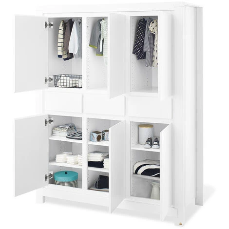 Armoire moderne et spacieuse Ă 6 portes et 3 tiroirs, en MDF noble laquĂ© mat, blanc. L’armoire moderne « Milk » de Pinolino inspire par ses lignes claires et sa couleur tendance, le blanc. Avec ses 6 portes et ses 3 tiroirs, elle offre beaucoup de place pour tout ce qui doit ĂŞtre rangĂ©. L’intĂ©rieur avec 6 Ă©tagères rĂ©glables en hauteur et 3 tringles Ă vĂŞtements ne laisse rien Ă dĂ©sirer ; les portes et les tiroirs sont Ă©quipĂ©s d’un système de fermeture en douceur ou automatique ; les poignĂ©es encastrĂ©es complètent le look. QualitĂ© Pinolino de haute qualitĂ© ; MatĂ©riau : MDF Uni, laquĂ© blanc, Dimensions de l’armoire : L 145 cm, P 57 cm, H 184 cm ; L’Ă©tendue de la livraison comprend une grande armoire, installation nĂ©cessaire.