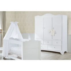 Grande armoire Ă 3 portes avec 4 Ă©tagères rĂ©glables en hauteur, 1 tringle Ă vĂŞtements et 2 tiroirs dont 3 et 2 compartiments Ă linge en pin massif, verni blanc, dimensions : L 160 x P 64 x H 190 cm. Cette armoire spacieuse est Ă©quipĂ©e de tiroirs Ă fermeture automatique et de ferrures Ă fermeture souple, de sorte que les tiroirs et les portes se ferment doucement et silencieusement. Des Ă©tagères supplĂ©mentaires pour le cabinet sont disponibles en option. Equipement initial idĂ©al pour une splendide chambre d’enfant. Le bois blanc et massif et les formes raffinĂ©es et splendides de « Pino » ne donnent pas seulement un caractère royal Ă la chambre du bĂ©bĂ©.