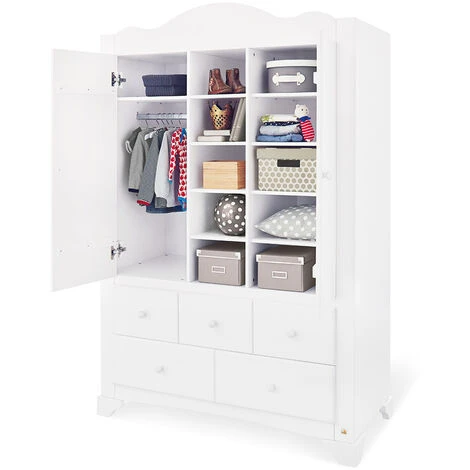 Pratique, belle armoire avec 2 portes, 2 tiroirs et 5 compartiments ouverts, en pin massif, verni blanc ; la structure du bois est visible. L’armoire « Pino » crĂ©e une atmosphère royale dans la chambre d’enfant – avec ses 2 portes et ses 2 tiroirs, l’armoire offre beaucoup de place pour tout ce qui doit ĂŞtre rangĂ© dans la chambre d’enfant. EquipĂ© de 5 Ă©tagères rĂ©glables en hauteur, 1 tringle Ă vĂŞtements ; tiroirs avec compartiments Ă vĂŞtements (celui du haut avec 3 compartiments et celui du bas avec 2 compartiments) ; les portes et les tiroirs sont Ă©quipĂ©s d’une fermeture automatique ou d’u. QualitĂ© Pinolino de haute qualitĂ© ; MatĂ©riau : pin massif, verni blanc ; Dimensions de l’armoire : L 126 cm, P 64, H 190 cm ; Volume de livraison : 1 grande armoire, installation nĂ©cessaire.