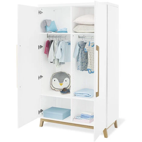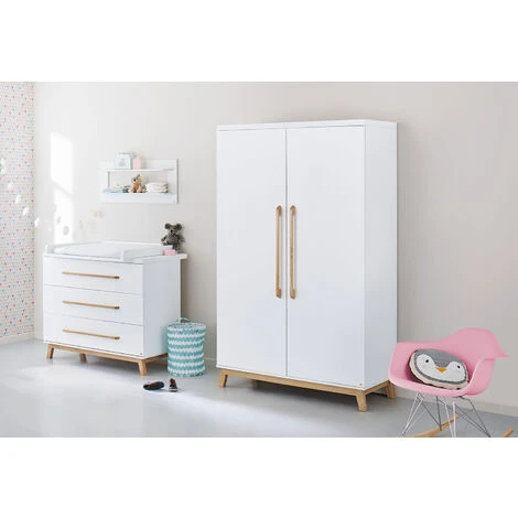 Armoire Ă©lĂ©gante au design nordique tendance avec 2 portes en MDF Uni noble laquĂ© mat, blanc et frĂŞne massif, laquĂ© transparent. L’armoire « Riva » est un lieu de bien-ĂŞtre scandinave inspirĂ© par ses formes lĂ©gères et libres ; avec ses deux portes, elle offre beaucoup d’espace de rangement pour tout ce qui doit ĂŞtre rangĂ© dans la chambre des enfants.. L’intĂ©rieur spacieux avec 4 Ă©tagères rĂ©glables en hauteur et 2 tringles Ă vĂŞtements ne laisse rien Ă dĂ©sirer ; les portes et les tiroirs sont Ă©quipĂ©s d’un système de fermeture en douceur pour une fermeture silencieuse et sĂ»re. QualitĂ© Pinolino de haute qualitĂ© ; MatĂ©riau : MDF Uni, laquĂ© et revĂŞtu de blanc, frĂŞne gris ; Dimensions de l’armoire : L 115 cm, P 58, H 193 cm ; recommandĂ© pour les enfants d’environ 0 Ă 99 ans ; la livraison comprend une armoire, installation nĂ©cessai.