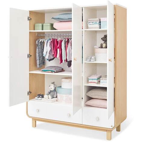 Grande armoire avec ferrures Ă fermeture souple, 5 Ă©tagères rĂ©glables en hauteur et 1 tringle Ă vĂŞtements, en dĂ©cor : Ă©rable et uni, blanc, dimensions : L 145 x P 54 x H 183 cm. Cette armoire spacieuse est Ă©quipĂ©e de tiroirs Ă fermeture automatique et de ferrures Ă fermeture souple, de sorte que les tiroirs et les portes se ferment doucement et silencieusement. Des Ă©tagères supplĂ©mentaires pour le cabinet sont disponibles en option. Equipement initial idĂ©al pour la chambre d’enfant moderne. Round » est le parfait mĂ©lange de design rĂ©tro branchĂ© et d’influences scandinaves.