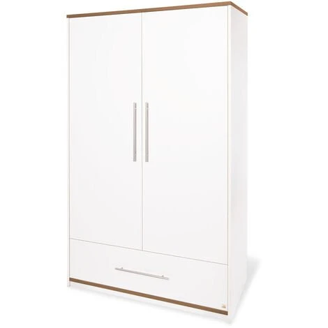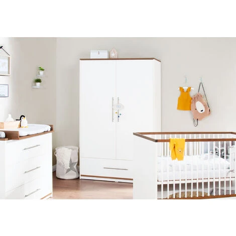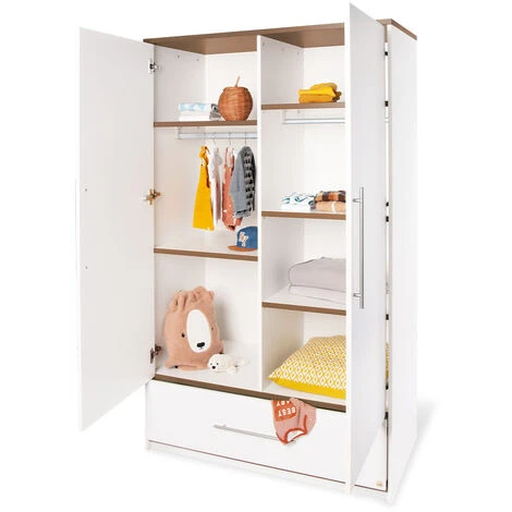 Armoire pratique Ă 2 portes et 1 grand tiroir, en dĂ©cor blanc avec des accents en dĂ©cor noyer avec structure en bois vĂ©ritable. L’armoire « Tuula », avec son grand tiroir et ses deux portes, offre beaucoup d’espace de rangement et impressionne par son aspect moderne et contrastĂ©.. L’intĂ©rieur avec 5 Ă©tagères rĂ©glables en hauteur et 2 tringles Ă vĂŞtements ne laisse rien Ă dĂ©sirer ; les portes et le tiroir sont Ă©quipĂ©s d’une fermeture automatique et douce pour une fermeture silencieuse et sĂ»re. QualitĂ© Pinolino de haute qualitĂ© ; MatĂ©riau : dĂ©cor blanc avec accents en noyer avec structure en bois vĂ©ritable, poignĂ©es en barre mĂ©tallique de haute qualitĂ© ; L 115 cm, P 58 cm, H 185 cm ; La livraison comprend une armoire, installation nĂ©cessaire.