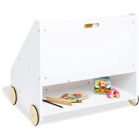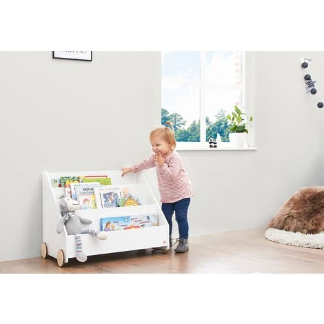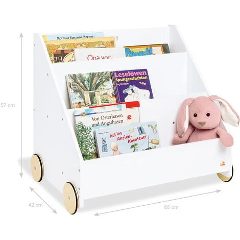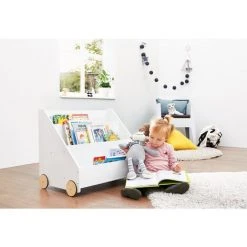 Bibliothèque pour enfants Ă roulettes « Lasse », avec 3 compartiments disposĂ©s en escalier, 1 compartiment secret Ă l’arrière et 4 roues en bois caoutchoutĂ©es. FabriquĂ© en MDF : blanc laquĂ©, dimensions L 65 x P 42 x H 57 cm, poids 10 kg, avec marquage CE. Lasse » offre beaucoup de place pour tous vos livres prĂ©fĂ©rĂ©s avec ses 3 compartiments disposĂ©s en forme de marche. De plus, la bibliothèque permet de mettre rapidement et facilement de l’ordre dans votre collection de livres. La surface peinte en blanc du produit s’intègre particulièrement bien Ă tout type de dĂ©coration intĂ©rieure et convient aussi bien aux filles qu’aux garçons. RecommandĂ© pour les enfants Ă partir de 3 ans. Au fond de l’Ă©tagère, il y a un petit compartiment secret dans lequel tous les trĂ©sors privĂ©s trouvent une place. Grâce aux 4 roues en bois caoutchoutĂ©es, l’Ă©tagère peut ĂŞtre dĂ©placĂ©e très facilement d’avant en arrière.
