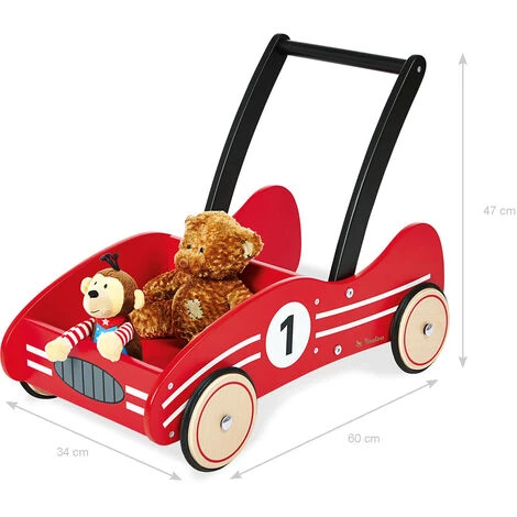 marcheur pour bĂ©bĂ© « Kimi », avec système de freinage, roues en bois caoutchoutĂ©es et essieux en acier. En bouleau massif, peint en rouge et noir, dimensions L 60 x l 34 x H 47 cm, hauteur de la poignĂ©e de poussĂ©e 47 cm, avec marquage CE, montage partiel nĂ©cessaire. Le système de freinage bien pensĂ© aide Ă bien maĂ®triser les premières tentatives de marche encore dangereuses. L’effet de freinage peut ĂŞtre facilement rĂ©glĂ© en continu et sans outils grâce Ă la tige de frein en acier rond avec des embouts en plastique. La grande surface de chargement de 27 x 26 cm offre beaucoup d’espace pour les jouets les plus importants dont vous avez besoin lors d’un voyage d’exploration. La poussette convient aux filles et aux garçons de 1 Ă 6 ans. Le trotteur particulièrement stable avec l’impression originale d’une voiture de course offre Ă votre enfant un support sĂ»r. Il peut ainsi apprendre Ă marcher sans problème et sans que la voiture ne se renverse. Kimi’ est une excellente idĂ©e de cadeau pou.