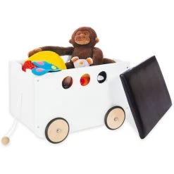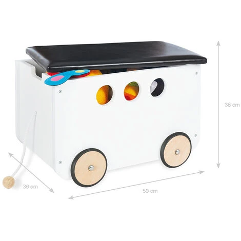 Coffre Ă jouets avec couvercle amovible, roues en bois caoutchoutĂ©es et corde de traction, capacitĂ© de charge 20 kg, en MDF Uni, peint en blanc et en simili cuir noir, dimensions : L 50 x l 36 x H 36 cm, poids 8 kg, montage nĂ©cessaire. L’ordre est amusant de cette façon ! La belle boĂ®te de rangement pour les enfants offre beaucoup d’espace de rangement pour tous les jouets. Grâce Ă la corde de traction et aux roues en bois caoutchoutĂ©es, tout peut ĂŞtre facilement emportĂ© partout sans la. La haute qualitĂ© de fabrication de la boĂ®te Ă jouets moderne garantit un plaisir durable. Il peut ĂŞtre chargĂ© jusqu’Ă 20 kg et le couvercle rembourrĂ© est amovible. Avec le mĂ©lange de noir et de blanc, la poitrine est absolument tendance et devient un vĂ©ritable accroche-regard dans toutes les chambres d’enfants. C’est un cadeau parfait pour les filles et les garçons pour leur anniversaire ou pour NoĂ«l.