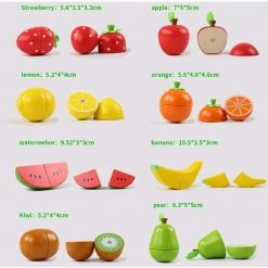 Ensemble de 11 pièces – l’ensemble comprend un plateau en bois de 26×16,5 cm, un couteau en bois et 5 fruits (pomme, orange, poire , banane et kiwi) en bois pour la coupe inclus. Convient aux enfants à partir de deux ans
