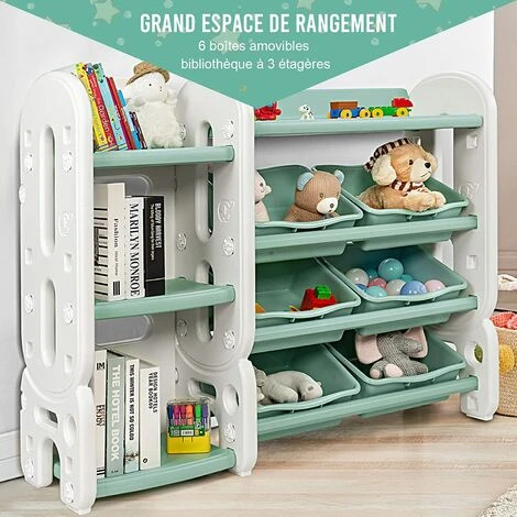6 boîtes et 1 bibliothèque à 3 étagères pour ranger toutes sortes de livres et de jouets