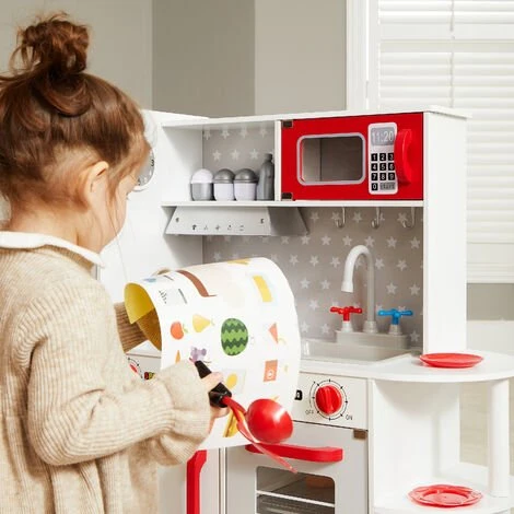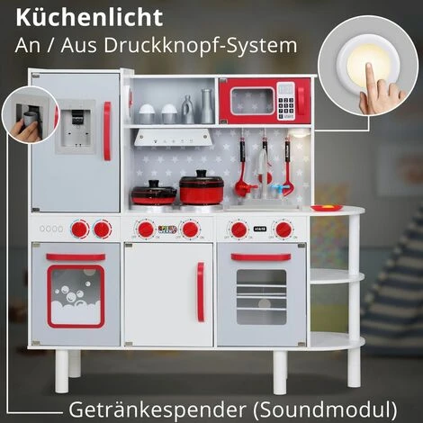 La sensation réaliste de jeu est renforcée par la plaque de four, l’évier avec un robinet rotatif, la lumière de cuisine avec un bouton-pression, les boutons rotatifs émettant un clic et le distributeur d’eau avec LED et effet sonores.
