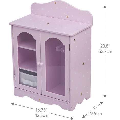 Vos poupées grandissent continuellement de ce fait elles sont certaines d’avoir un grand choix de vêtements. Offrez-leurs un mobilier chic et élégant pour accrocher toutes leurs affaires préférées avec cette armoire de poupée Twinkle Stars Princess ! L’armoire est décorée d’une peinture non toxique violette avec des étoiles scintillantes dorées et blanches sur sa surface. (L) 42.55 cm x (l) 22.86 cm x (H) 52.71 cm.