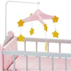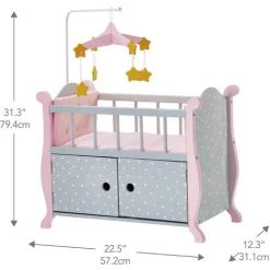 Votre adorable poupon a besoin d’un lit spécialement conçu pour lui ? Apportez-lui dès aujourd’hui dans votre maison cet élégant berceau gris avec des pois blancs et une finition rose. Il est livré avec un mobile musical assorti avec des étoiles jaunes. (L) 57.15 cm x (l) 31.12 cm x (H) 79.38 cm.