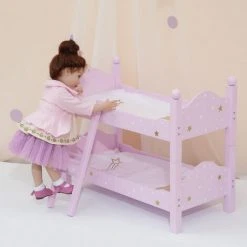 – Un lit superposĂ© couleur lavande pour poupĂ©e de taille maximum de 45 cm. Fonctionne aussi comme 2 lits simples cĂ´te Ă cĂ´te. Comprend une Ă©chelle 2 draps de lit doux et deux oreillers dorĂ©s.