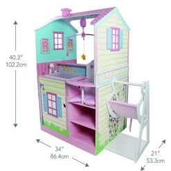 Votre enfant va pouvoir offrir une vraie maison à ses poupons ! La nurserie Dream Land d’Olivia’s Little World ressemble à une vraie maison avec un joli toit rose et des fenêtres avec volets. La nurserie est spécialement conçue pour toutes les poupées et poupons préférés de votre enfant. La nurserie est conçue comme une maison de poupée à 2 façades avec un mobile musical au-dessus. D’un côté, vous trouverez une table à langer, des petits paniers en tissu rose pour y ranger des vêtements. Tournez-la de l’autre côté et vous trouverez une baignoire avec robinet, une chaise haute avec des compartiments et un placard de rangement pour les couches. La chaise à bascule blanche est un ajout amusant à la maison de poupée, et elle est séparé de la maison.