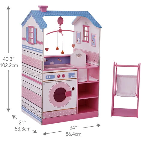 Votre enfant va pouvoir offrir une vraie maison à ses poupons ! La nurserie Dreamland de d’Olivia’s Little World ressemble à une vraie maison avec un joli toit bleu et des fenêtres avec volets. La nurserie est spécialement conçue pour toutes les poupées et poupons préférés de votre enfant. La table à langer repose au-dessus d’une jolie décoration murale comprenant une licorne et des mots d’amour pour apporter de la douceur à votre poupon avant le coucher. La maison est munie d’un mobile musical rose et de petits tiroirs en toile rose pour ranger les vêtements de poupons. Tournez-la de l’autre côté et vous trouverez une chaise haute avec des étagères de rangement, une baignoire avec robinet afin que votre poupon puisse prendre un bain, et une machine à laver pour laver tous ses vêtements. La chaise à bascule rose est un ajout amusant à la maison de poupée, et elle est séparé de la maison. Les poupées peuvent s’amuser à se balancer pendant des heures ici ! Vos enfants vont adorer cette maison spécialement conçue pour leurs poupons et poupées ! DIMENSIONS (L) 86.36 cm x (l) 53.34 cm x (H) 102.24 cm.