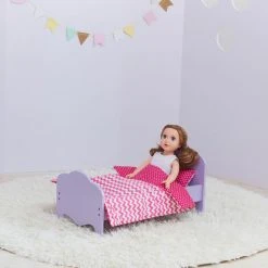 -Le lit en bois rose dispose d’une tĂŞte de lit et d’un pied de lit, ainsi que de linge de lit de poupĂ©e et d’un oreiller doux rĂ©versible.