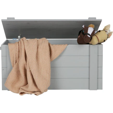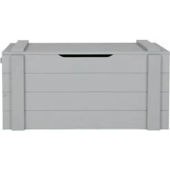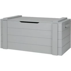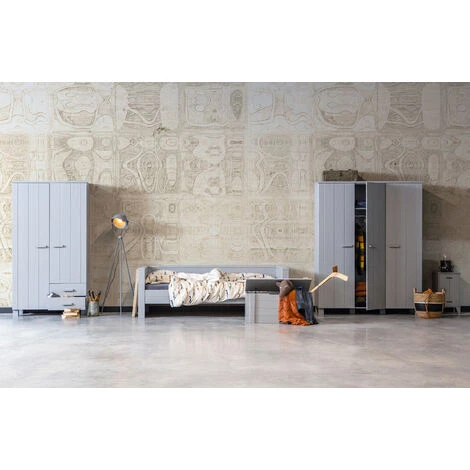 Boîte de rangement robustes avec des planches de pin massif brossé peint dans la couleur gris béton. La Caisse a un chanfrein horizontal lignés. Cette caisse fait partie de la chambre Dennis, cette chambre comprend un canapé-lit ou ce lit sans murs, un bureau, une armoire, un coffre de rangement, table de chevet et étagère murale. Ce meuble est en bois brossé qui lui donne son style vintage particulier et fait apparaitre des belles petites lignes et taches caractéristiques du style. Cet article est livré dans un paquet d’assemblage simple et avec un guide d’instructions de montage clair.